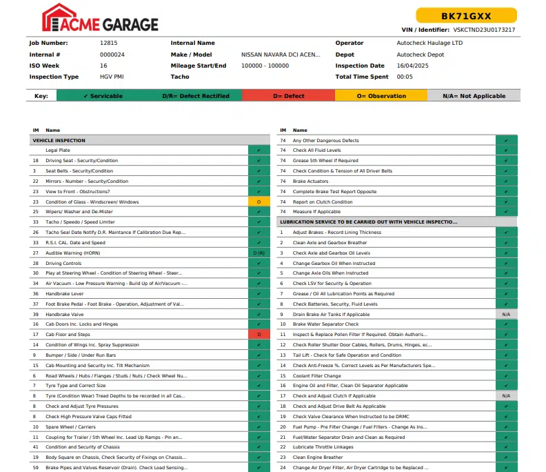The image below showcases a portion of a completed 6–8 weekly HGV inspection carried out on Autocheck.
